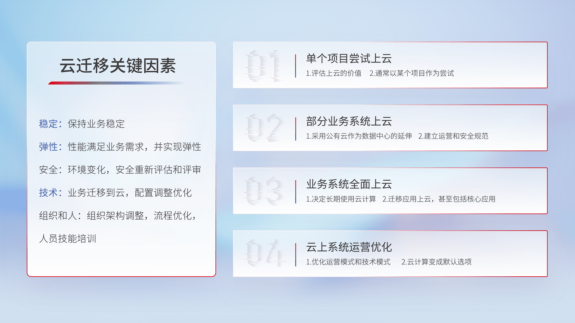 结合实际业务,,,,从规划设计、、云平台选型、、云原生改造、、、、数据迁移、、、集成交付,,,,迁移全过程为客户识别最佳上云路径,,,做好风险识别管理,,,,设计网络架构、、、身份权限、、安全审计合规、、、操作审计、、日志审计、、监控告警策略、、多站点容灾设计等,,,,对云上基础设施进行整体规划,,,提升IT治理水平,,,,以满足弹性、、、高可用、、、、高性能的需求。。。。