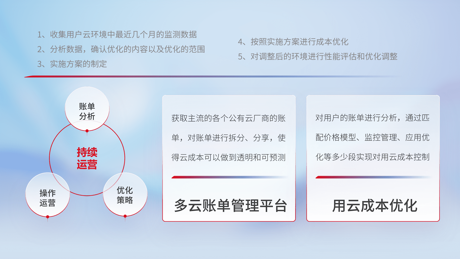 通过多云纳管,,,以统一的资源数据模型把客户的云资源进行抽象和封装,,进而实现对多云资源的统一操作,,,保障云资源管理的可靠性、、、稳定性与可用性。。。。量身定制化运维内容,,,,配置、、、、开发运维、、、补丁管理、、备份、、监控、、认证和访问管理、、审计和日常巡检等,,保障在用云过程中的可靠度,,稳定度以及高可用率。。。。