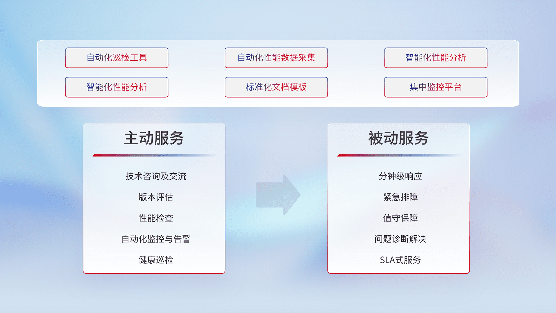 智能化工具和标准化文档,,,保障服务质量,,,提供主动服务(包含技术咨询、、、、版本评估、、性能检查、、、自动化监控与告警、、、、健康巡检)和被动服务包含(分钟级响应、、、紧急排障、、值守保障、、、问题诊断解决、、、、SLA服务)。。。