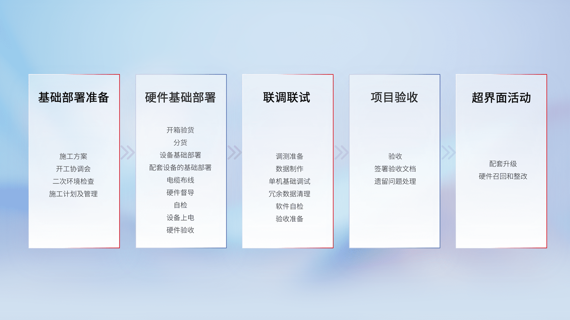 从基础部署准备、、硬件基础部署、、、联调联试、、、项目验收、、、、越界面活动的全过程可追溯,,,保证施工质量和进度。。